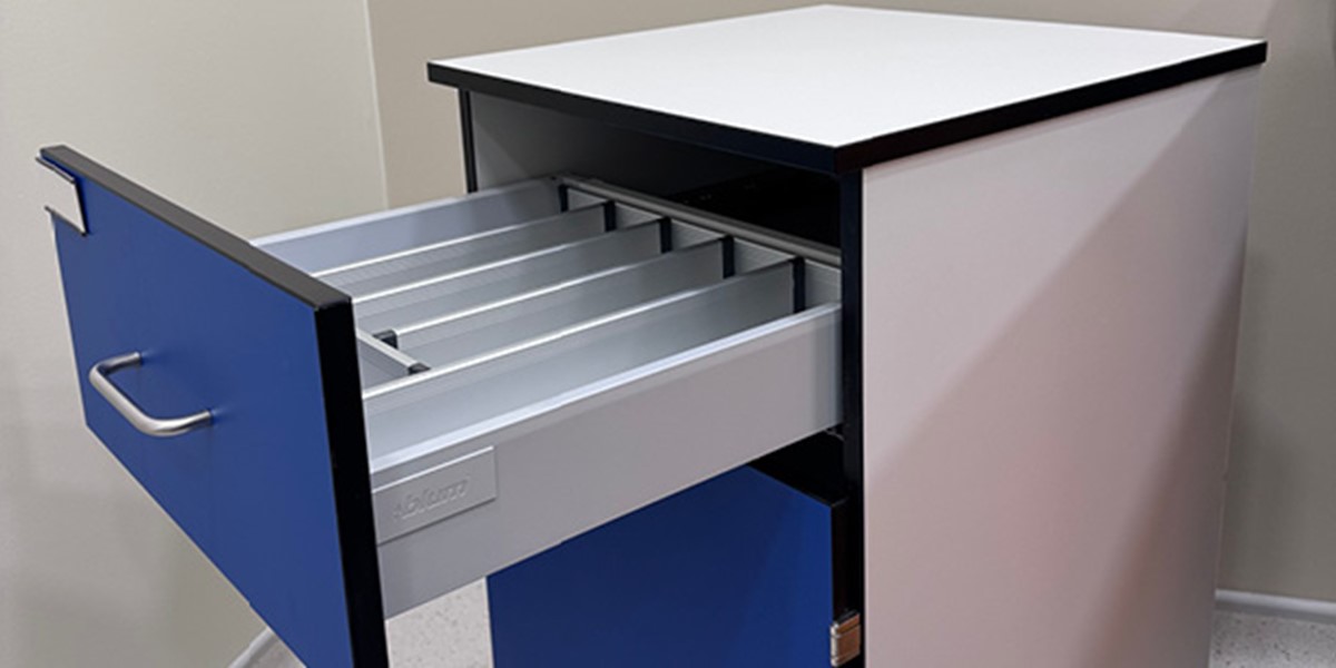 Manufactured to suit individual requirements, our caster units can be made using a range of high-performance finishes including moisture-resistant MFC and Trespa, offering both hygiene and durability in demanding settings. Drawers, shelves and internal layouts can be fully customised to suit specific equipment or storage needs.