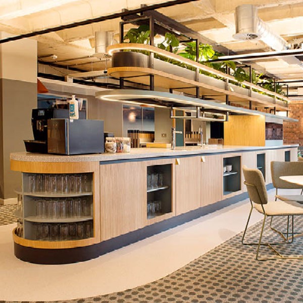 Designed for high-traffic co-working environments, this large central teapoint was crafted in our in-house joinery workshop using Cathy Mocke’s designs from 3D Reid.