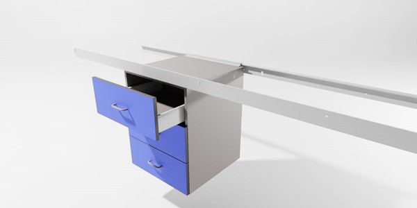 The suspended storage units are mounted on a powder-coated steel frame allowing them to slide and be repositioned as needs change - ideal for evolving lab environments. Optional sink and draining board configurations provide practical working areas, while integrated service runs and removable modesty panels keep all containment hidden yet easily accessible for maintenance and upgrades.