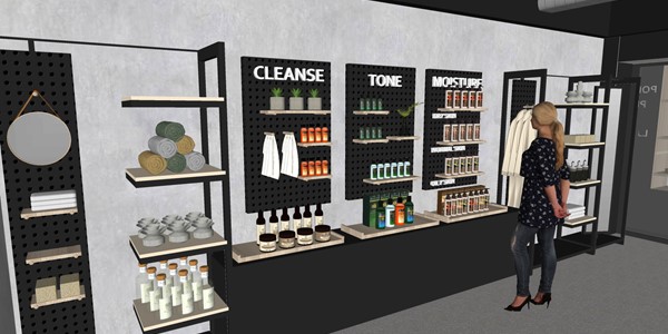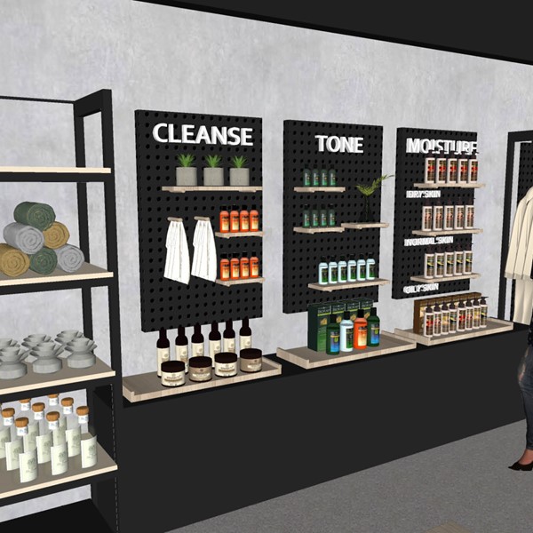 Manufactured from stained black plywood, each pegboard includes customisable shelving and interchangeable wooden letters, allowing independent businesses to tailor their displays to suit their unique identity and product range. Whether showcasing skincare, gifts, clothing or accessories, the system offers a consistent but versatile platform that enhances presentation while keeping the space cohesive.