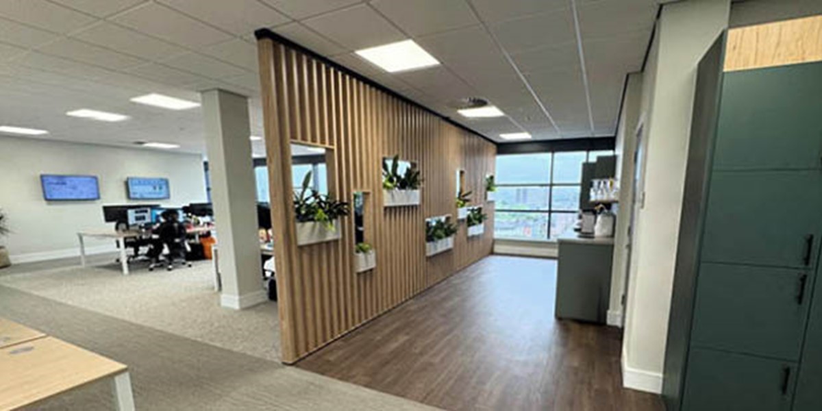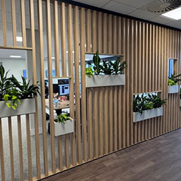 Constructed from high-quality timber, each partition features evenly spaced vertical slats that add texture and visual interest, while providing a semi-private barrier between work zones. What makes these partitions truly unique is the integration of built-in planter spaces, allowing greenery to be introduced directly into the joinery. This not only softens the appearance of the woodwork but also contributes to improved air quality and a more inviting atmosphere for staff and visitors alike.