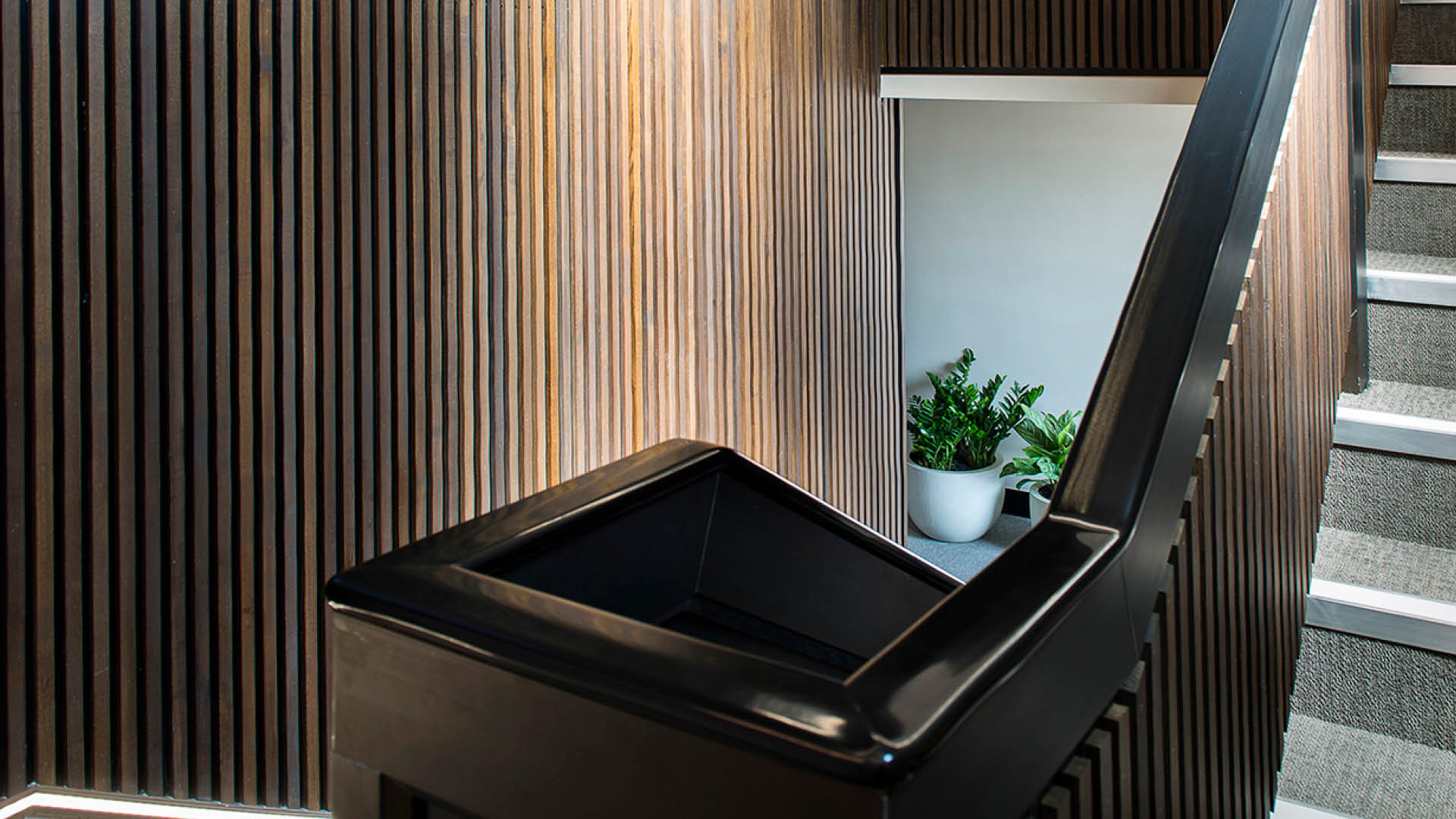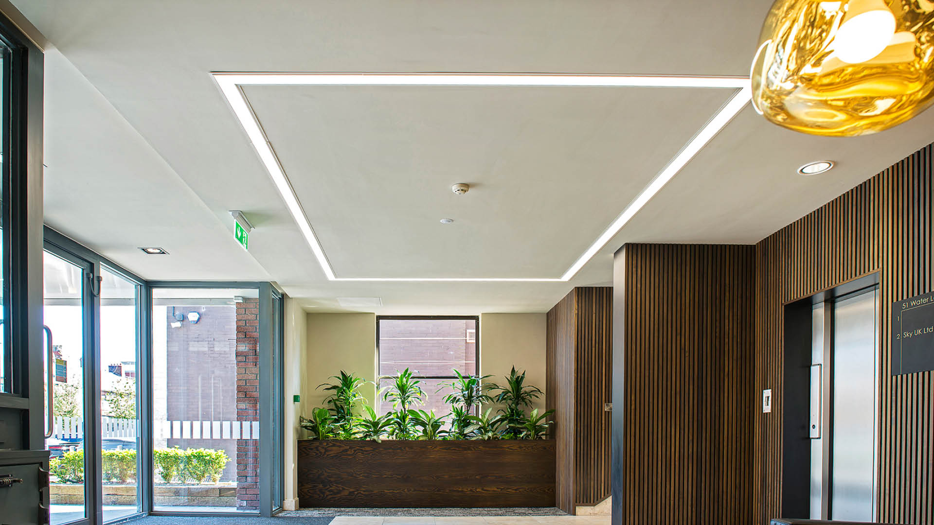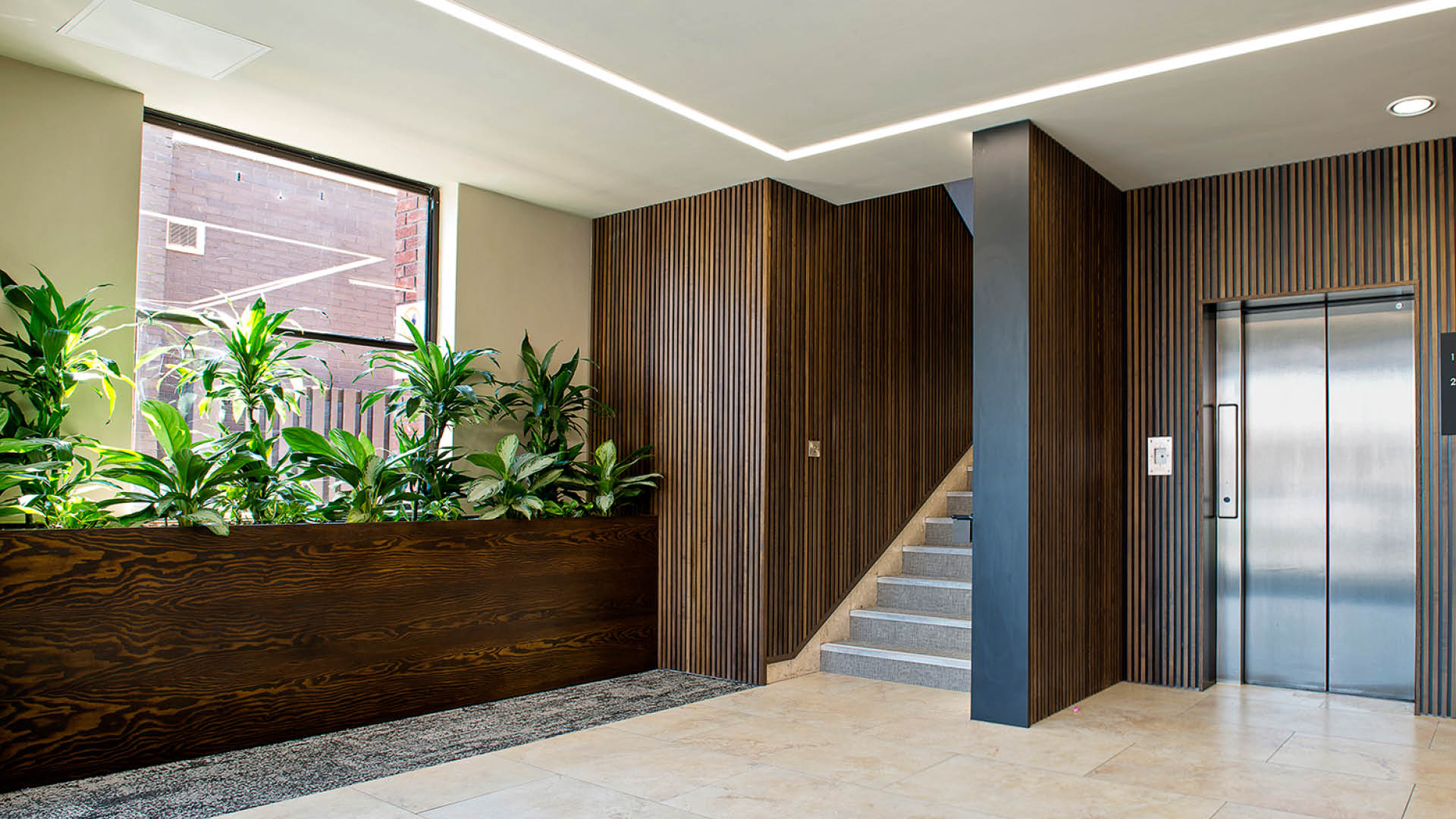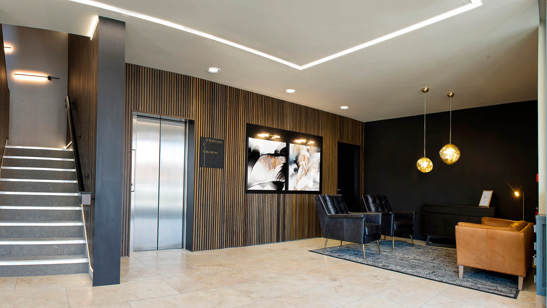 We were recently asked on behalf of JMC Surveyors to refurbish the Reception and Common Areas at 51 Water Lane in the heart of Wilmslow. Designed inhouse, the scheme features a bespoke slatted timber system manufactured in our joinery workshop.