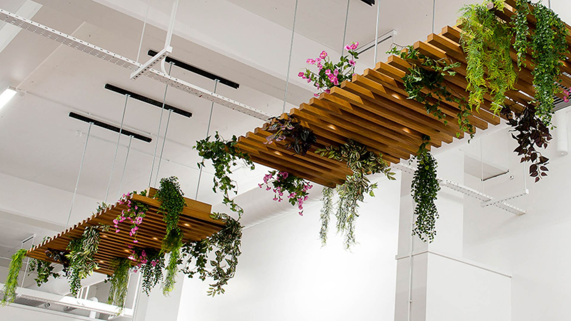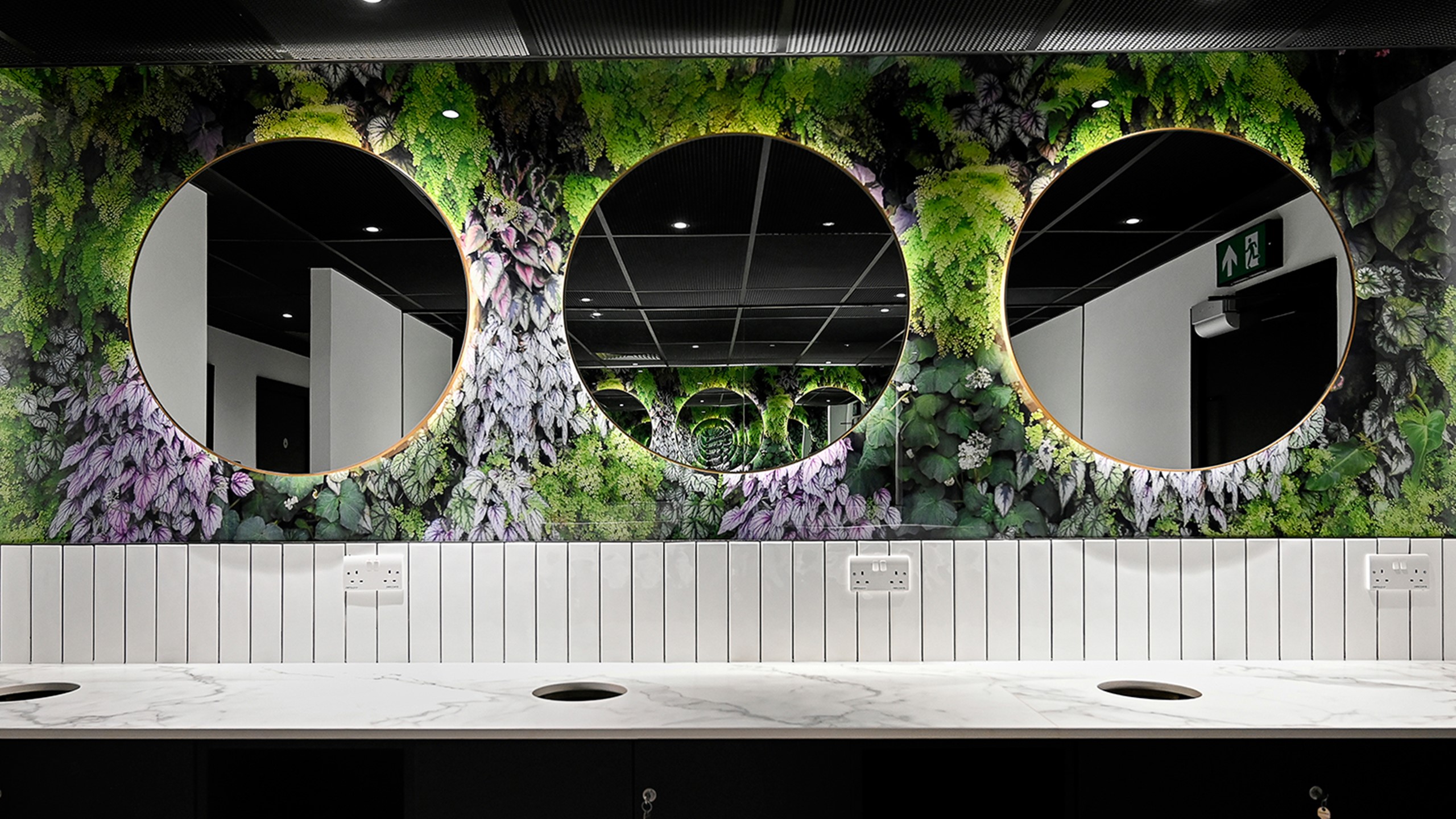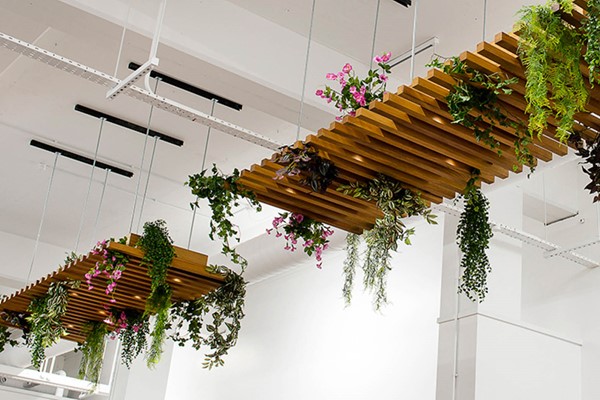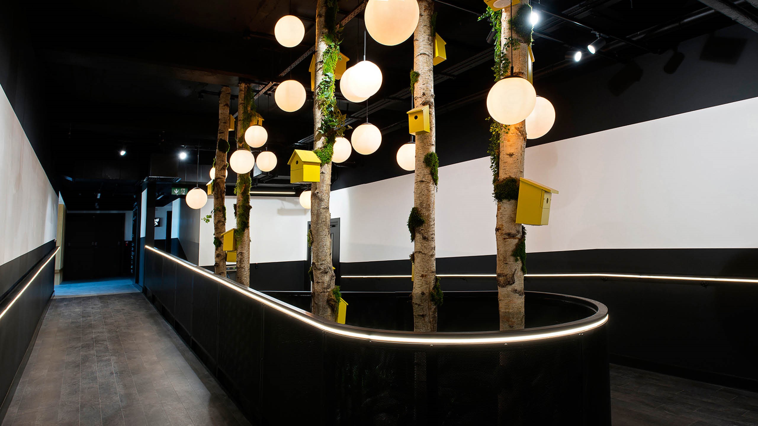 The ramp between the two levels features an art installation that was manufactured at the Amspec workshop. It features dried real birch bark tree trunks with natural moss and foliage supplied by Innerspace Cheshire. Mounted on the tree trunks are bright yellow bird boxes which are linked to an AV system to emit sounds of birdsong, giving a sense of being outside in the parkland that surrounds the building. The installation also includes feature globe lighting, brightening an area devoid of natural light.