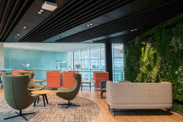 We installed a replica green wall to conceal access panels and services. The green wall was made using Sedum mats with added Ferns, Palm, Scindapsus and other foliage. It was supplied and installed by I Want Plants.