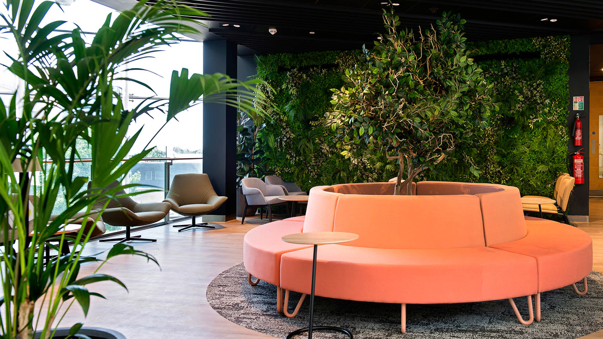 Furniture was supplied by Sixteen3, Frovi & Orangebox and flooring from Interface and Shaw Contract. 5 curved seats from Sixteen3 were used to make a circular focal seating area in the centre of the room with an artificial Ficus tree at the centre