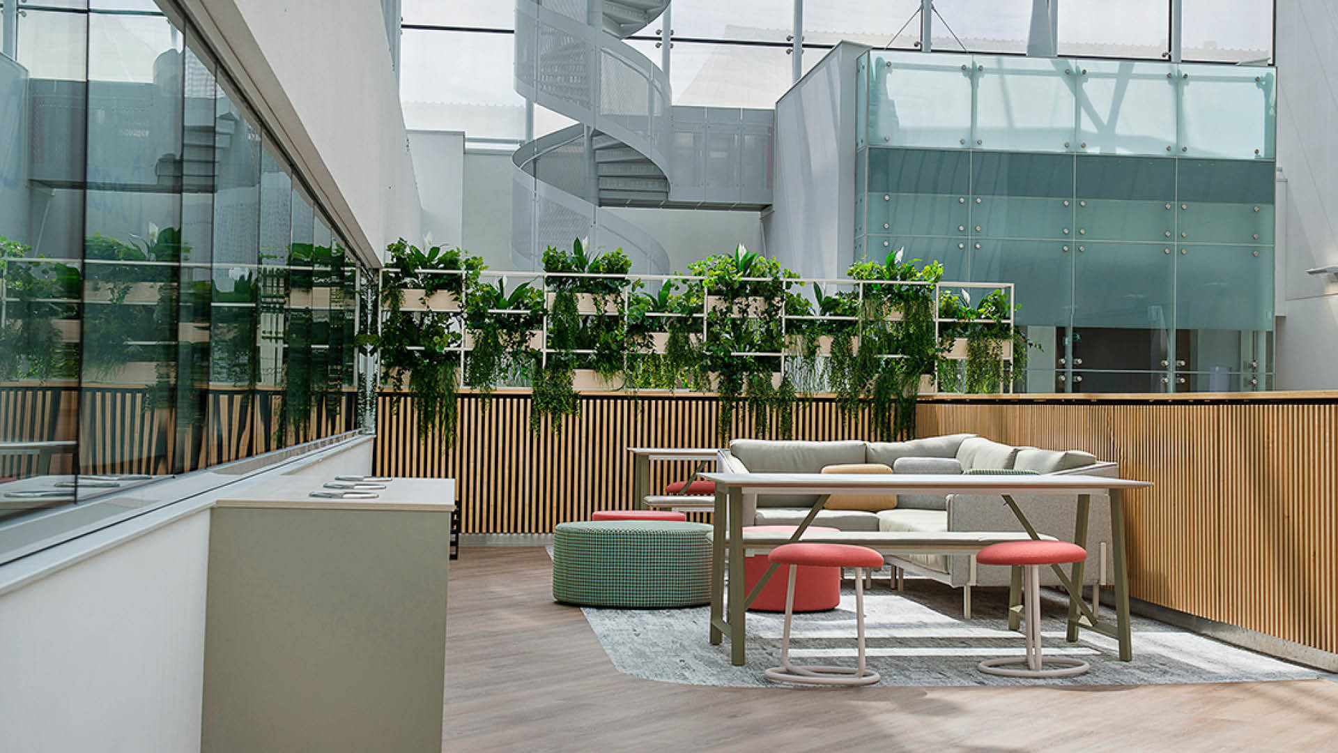 The purpose of the area is to provide informal breakout areas where people can meet outside of an office setting. The garden area was designed to elevate the look and feel of the main atrium.