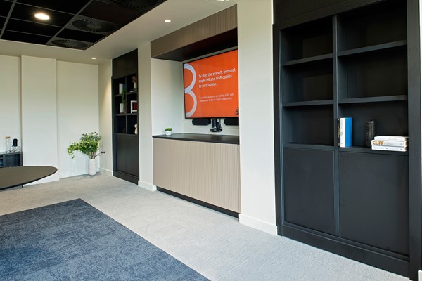 - Our Design team collaborated with AVM, a leading audio-visual technology provider, to build custom TV screen surrounds with integrated audio-visual solutions, seamlessly merging screens, speakers and cameras into the office spaces.