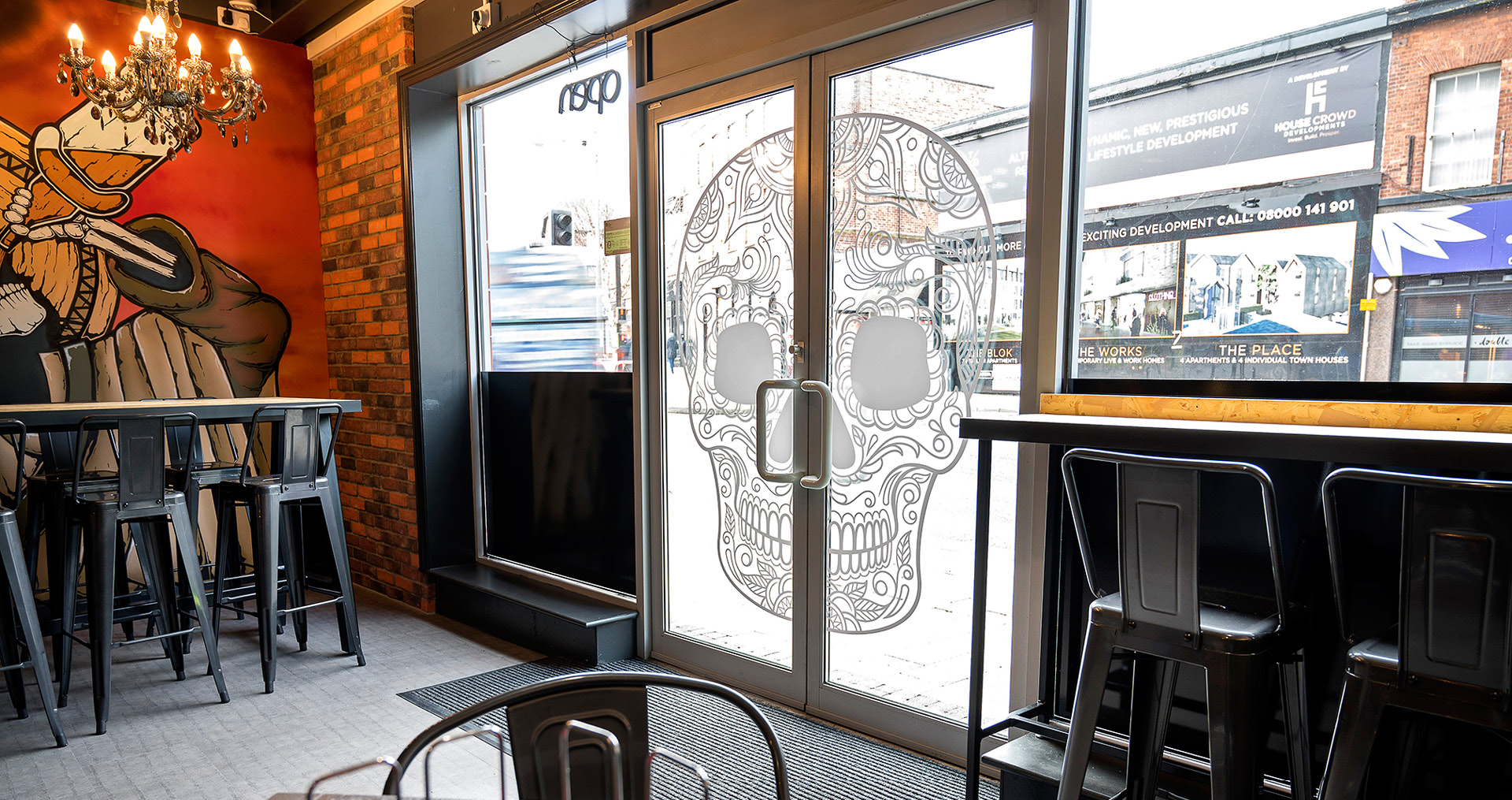 Due to Burrito Picante’s competitive high-street location, it was essential that our designers prioritised the external design in order to attract the many passers-by into the restaurant. After installing brightly coloured signage, we teamed up with 4D creations to supply sugar skull vinyl graphics for the glass doors, to ensure the restaurant stands out against its competition in the area.