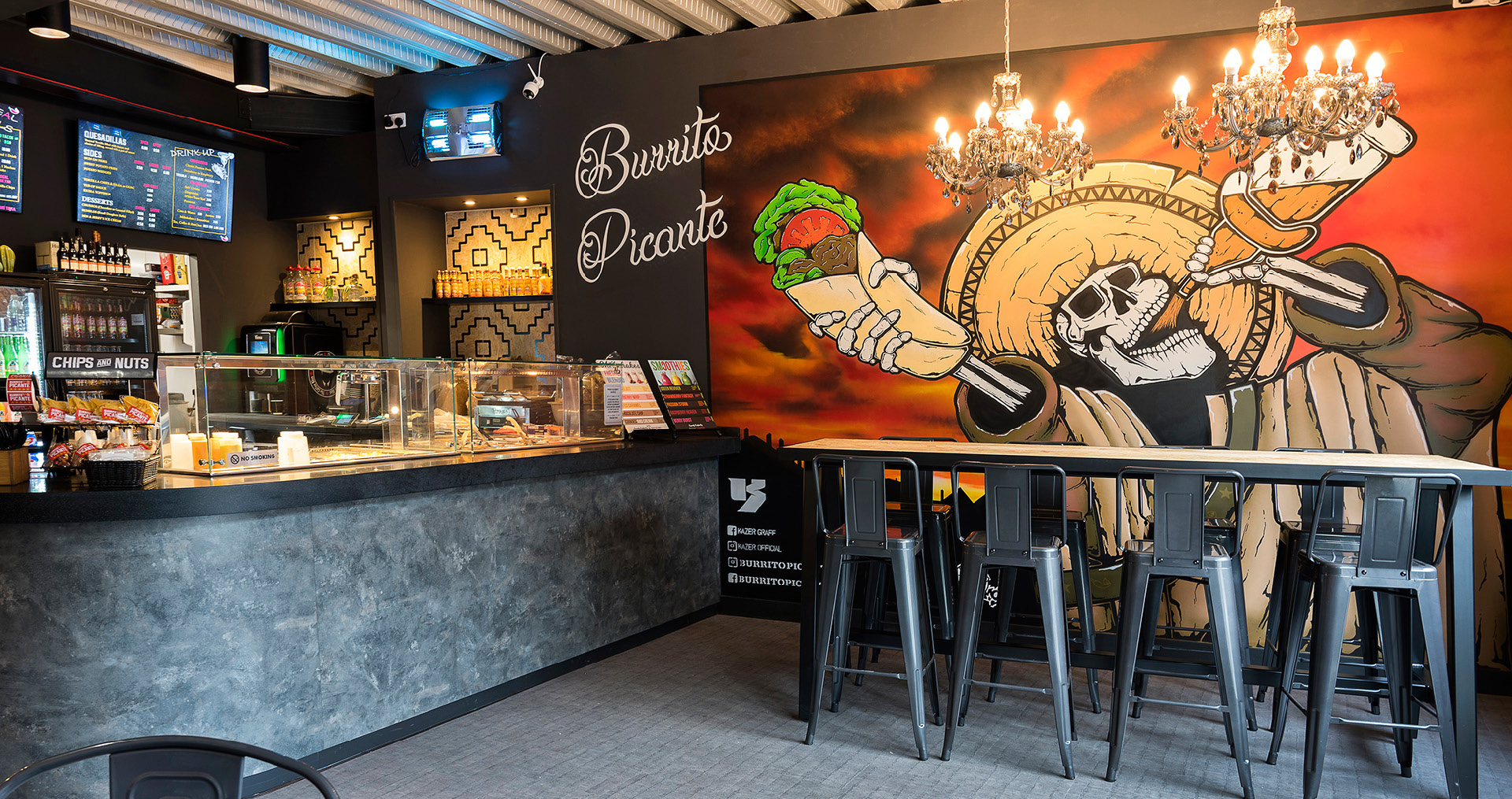 We were approached by Nick, the owner of Burrito Picante as he felt the design of his restaurant was lacking vitality and needed to be brought to life again. He wanted to remain true to his Mexican food and create a space that had an authentic-yet-unique look and feel. Amspec were appointed to fully redesign and refurbish the restaurant. Nick enlisted our help to create a strong, recognisable brand to carry throughout his additional franchises.