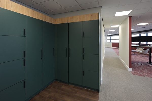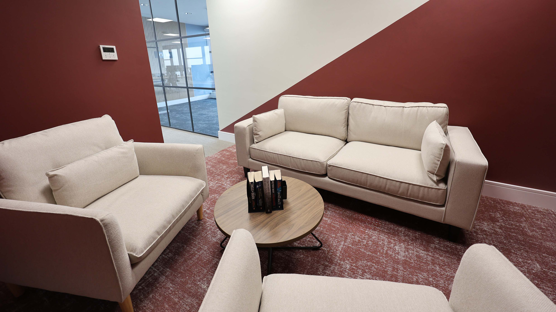 Bespoke joinery played a key role in the project, with custom-built storage planter boxes and divider planter partitions helping to define and enhance the space. Additional bespoke elements included a meeting table for the signature snug room, a striking reception desk, a canteen servery and a tea point with a dedicated recycling station—an important feature for the client.