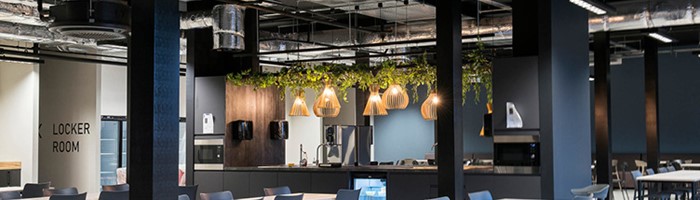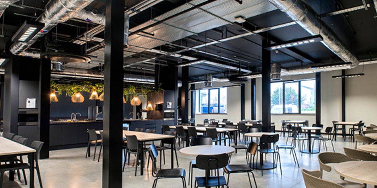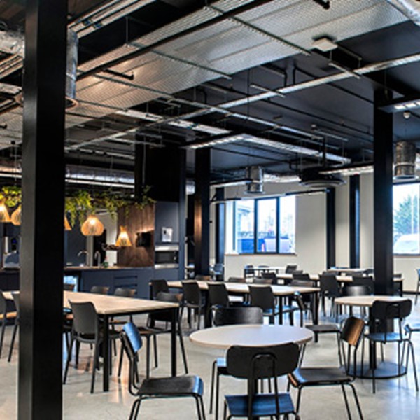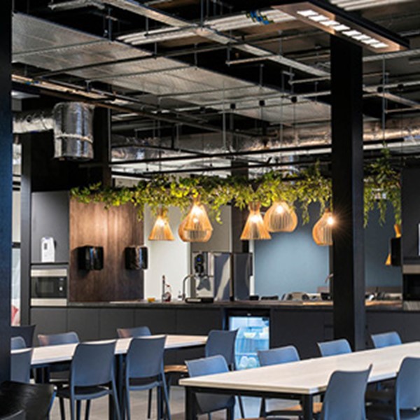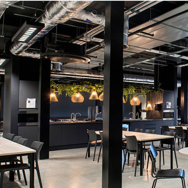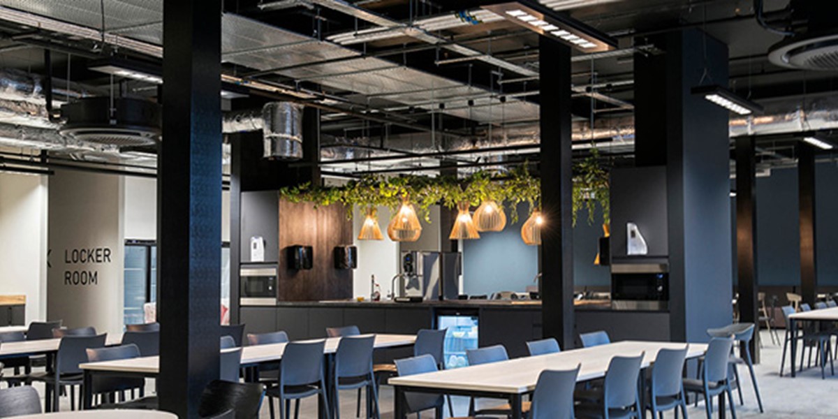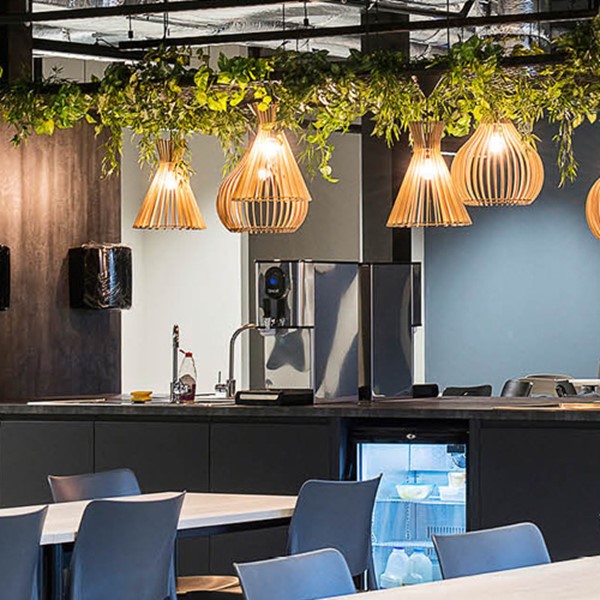 This bespoke kitchen was created for the staff amenities area at The Fragrance Shop, combining functionality with striking design. Suspended planters add a fresh, biophilic touch, bringing greenery into the workspace and softening the industrial aesthetic.