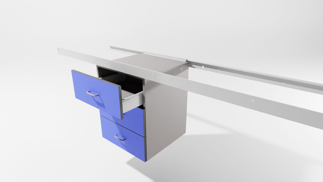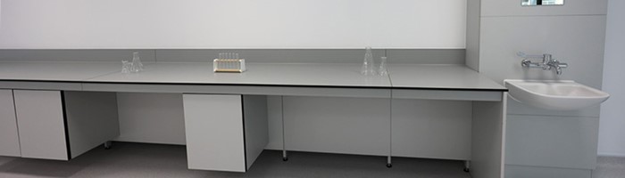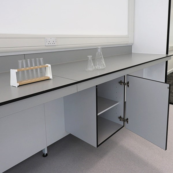 The suspended storage units are mounted on a powder-coated steel frame allowing them to slide and be repositioned as needs change - ideal for evolving lab environments. Optional sink and draining board configurations provide practical working areas, while integrated service runs and removable modesty panels keep all containment hidden yet easily accessible for maintenance and upgrades.