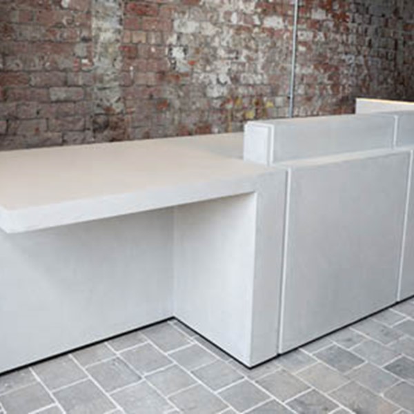 Set within a characterful, exposed-brick environment, the reception desk provides a striking yet seamless focal point. We used Ideal Work microcement - a high-quality, durable material that offers a sleek, modern finish while complementing the raw textures of the mill setting.