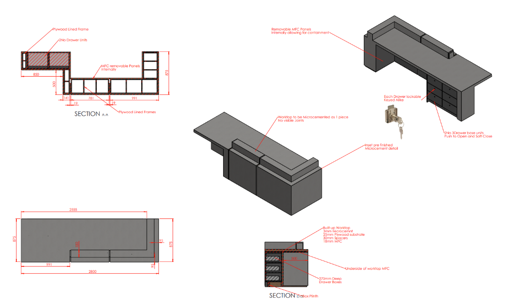 Our joinery team travelled to Italy to train with Ideal Work gaining hands-on experience in application techniques to ensure a flawless result. The smooth, continuous surface of the desk, with its clean lines and subtle texture gives it a refined and understated look. Microcement comes in a wide range of finishes and tones, which allowed us to tailor the desk’s appearance to complement the surrounding space perfectly.