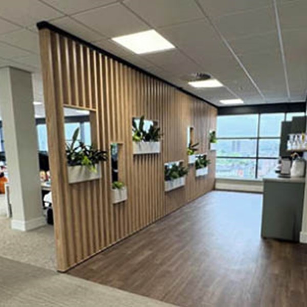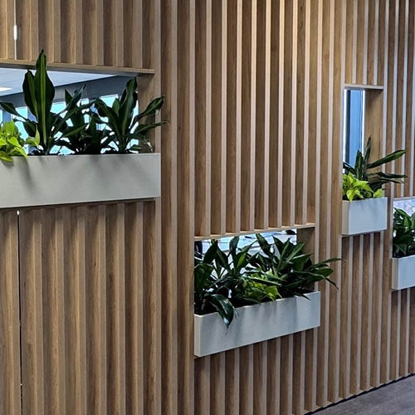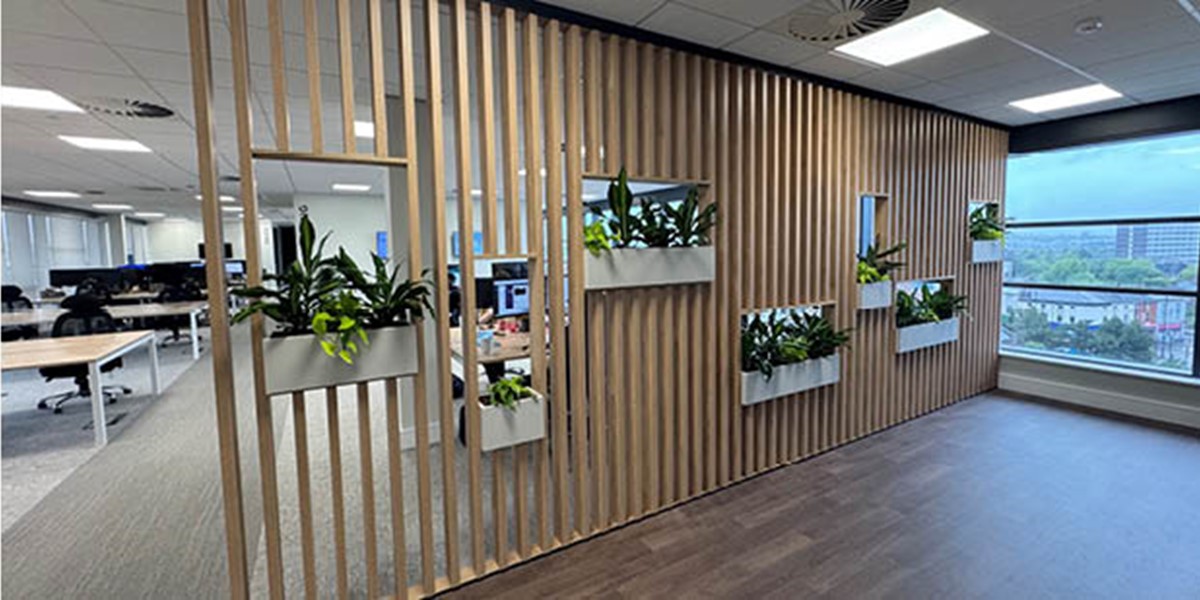 Constructed from high-quality timber, each partition features evenly spaced vertical slats that add texture and visual interest, while providing a semi-private barrier between work zones. What makes these partitions truly unique is the integration of built-in planter spaces, allowing greenery to be introduced directly into the joinery. This not only softens the appearance of the woodwork but also contributes to improved air quality and a more inviting atmosphere for staff and visitors alike.