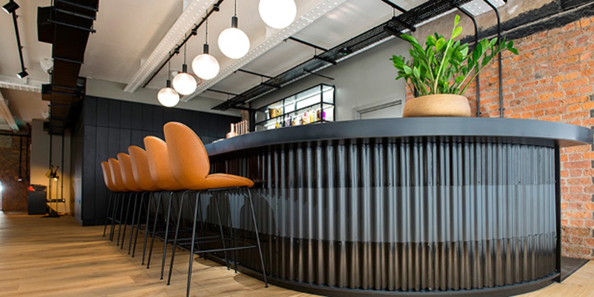 This curved bar was designed and manufactured for a breakout area in Bonded Warehouse, part of the iconic former Granada Studios in Manchester. Created to bring warmth and character to the industrial-style setting, the bar combines contemporary finishes with timeless detailing to suit the vibrant shared workspace.