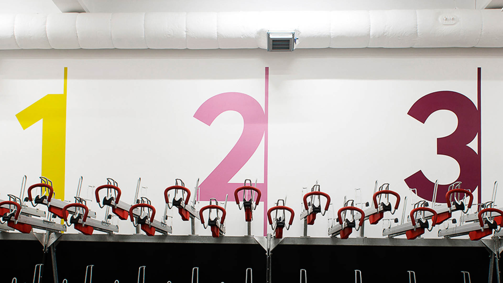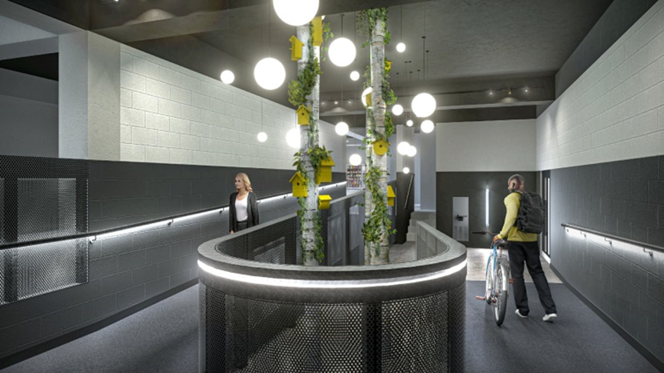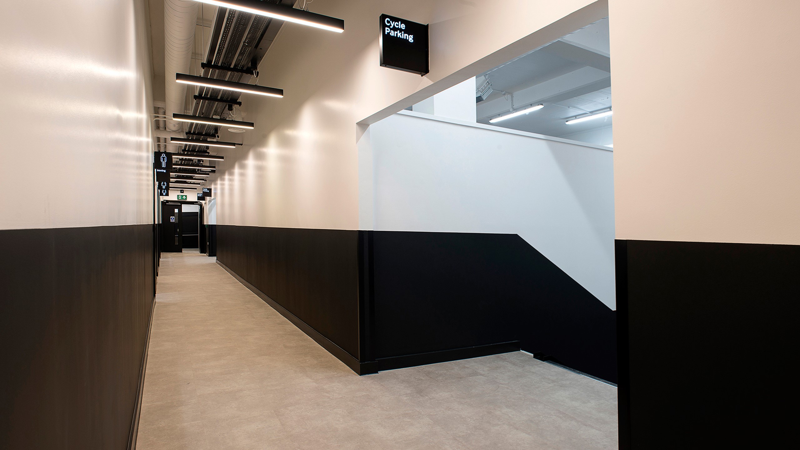 Throughout areas where bicycles are expected to be moving, there is a durable wall protection zone formed with a deep band of heavy-duty black paint painted at low level directly on the walls, and matching black aluminium corner protectors and a bump rail for ease of maintenance and to prevent damage from knocks and scrapes.
