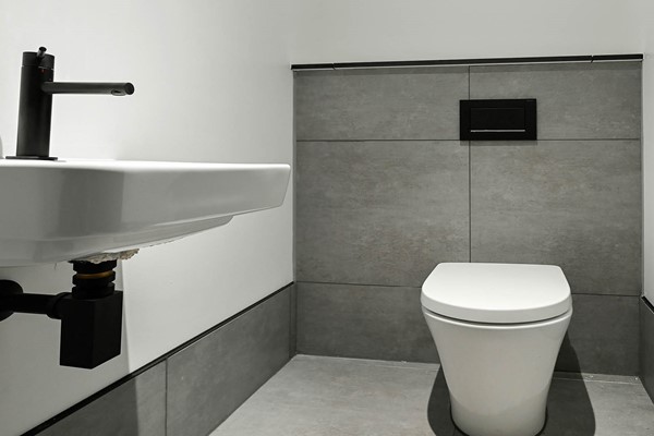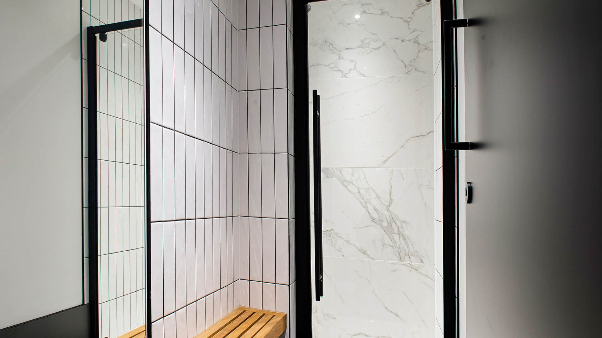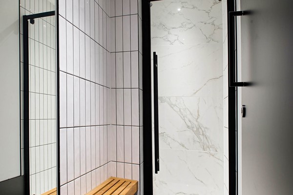 We built male and female showers and changing areas which have underfloor heating throughout. These include individual shower rooms, toilets and feature perspex vanity stations with integrated hair tools such as hairdryers and hair straighteners. Hamer Way designed the shower rooms with marble tiles and black fittings to give the sense of luxury hotel bathrooms. We also built an Ironing station located centrally between the two changing areas.