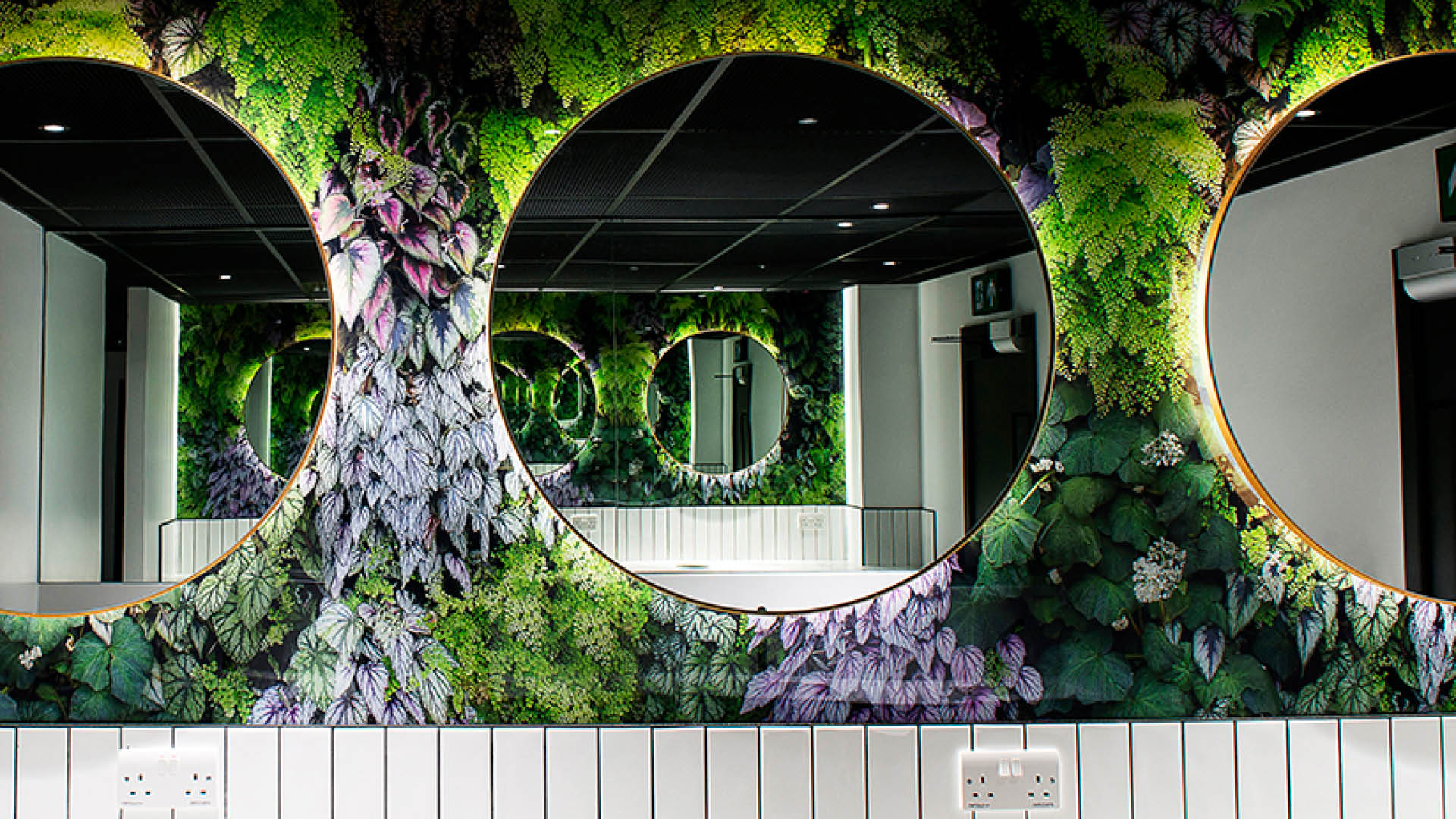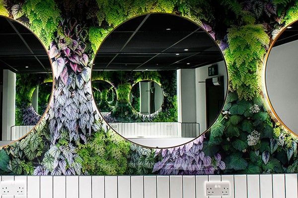 The ramp between the two levels features an art installation that was manufactured at the Amspec workshop. It features dried real birch bark tree trunks with natural moss and foliage supplied by Innerspace Cheshire. Mounted on the tree trunks are bright yellow bird boxes which are linked to an AV system to emit sounds of birdsong, giving a sense of being outside in the parkland that surrounds the building. The installation also includes feature globe lighting, brightening an area devoid of natural light.
