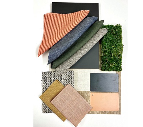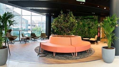 Furniture was supplied by Sixteen3, Frovi & Orangebox and flooring from Interface and Shaw Contract. 5 curved seats from Sixteen3 were used to make a circular focal seating area in the centre of the room with an artificial Ficus tree at the centre