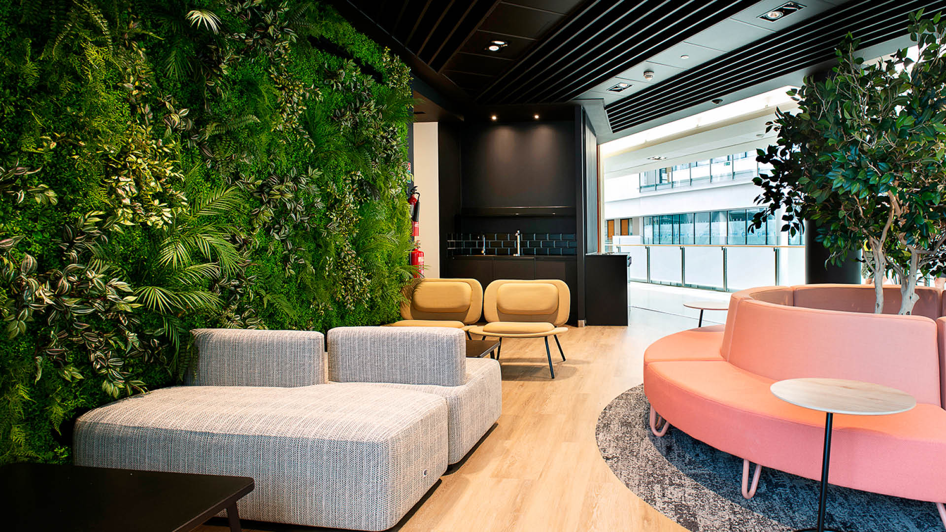 We installed a replica green wall to conceal access panels and services. The green wall was made using Sedum mats with added Ferns, Palm, Scindapsus and other foliage. It was supplied and installed by I Want Plants.