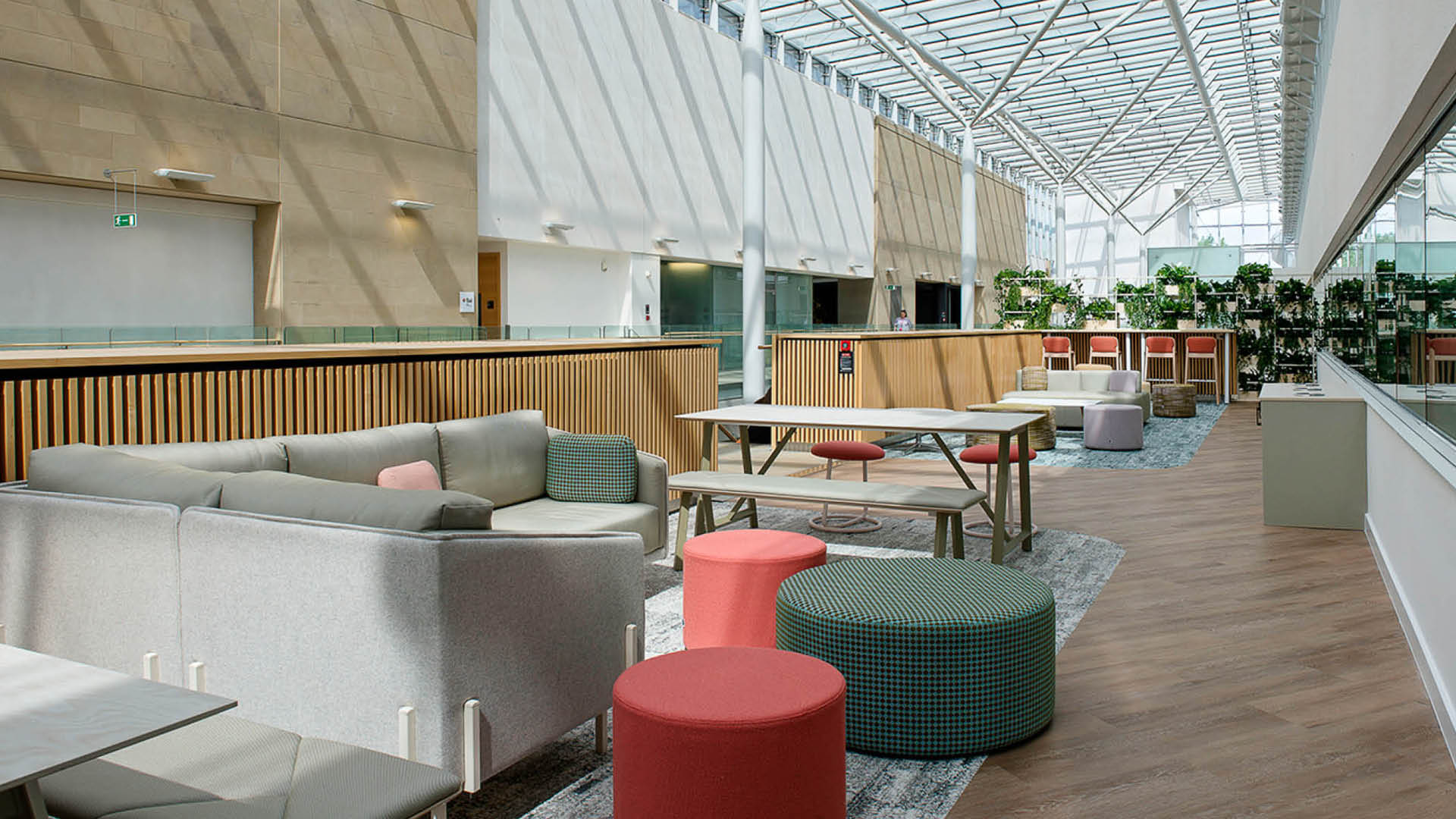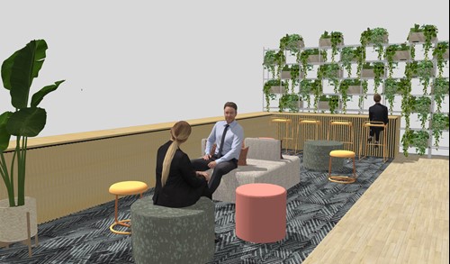 The purpose of the area is to provide informal breakout areas where people can meet outside of an office setting. The garden area was designed to elevate the look and feel of the main atrium.
