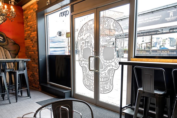 Due to Burrito Picante’s competitive high-street location, it was essential that our designers prioritised the external design in order to attract the many passers-by into the restaurant. After installing brightly coloured signage, we teamed up with 4D creations to supply sugar skull vinyl graphics for the glass doors, to ensure the restaurant stands out against its competition in the area.