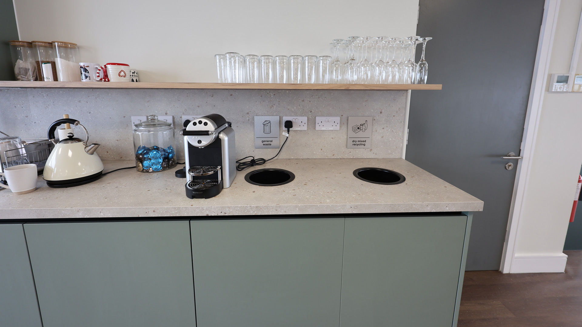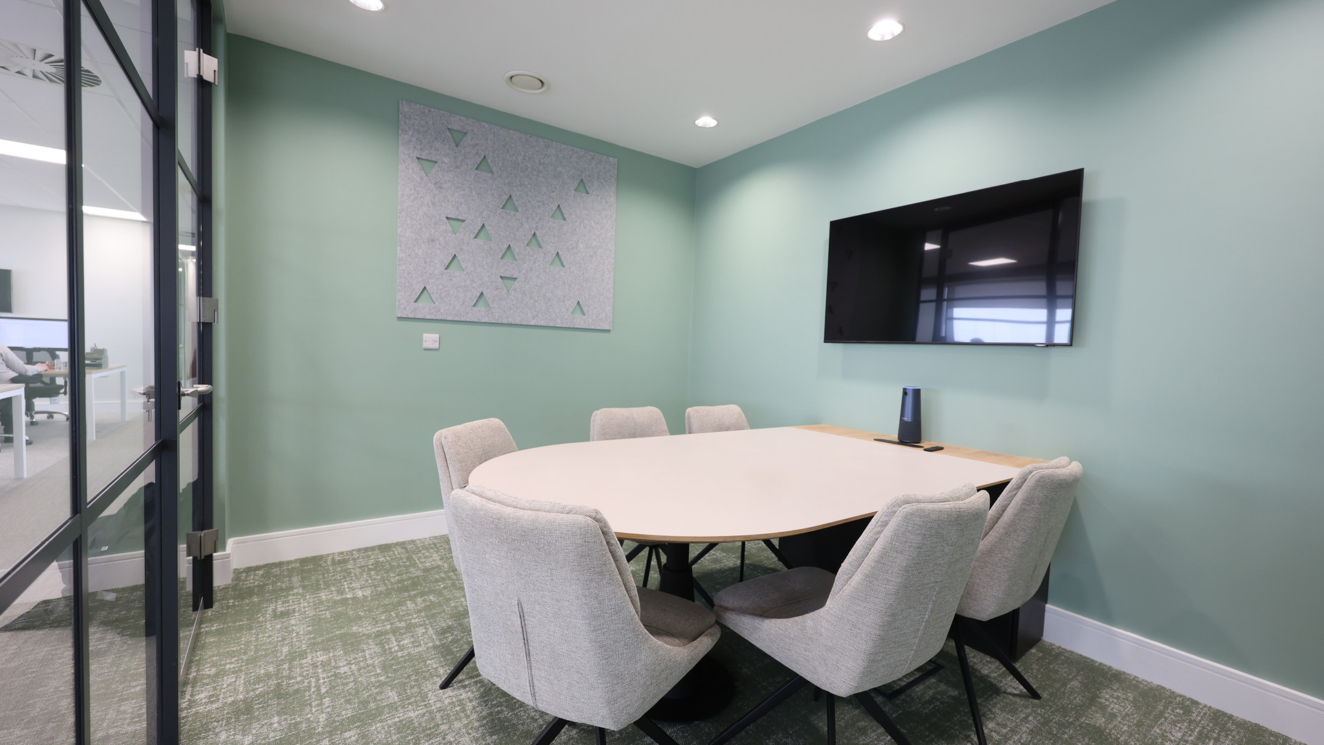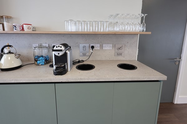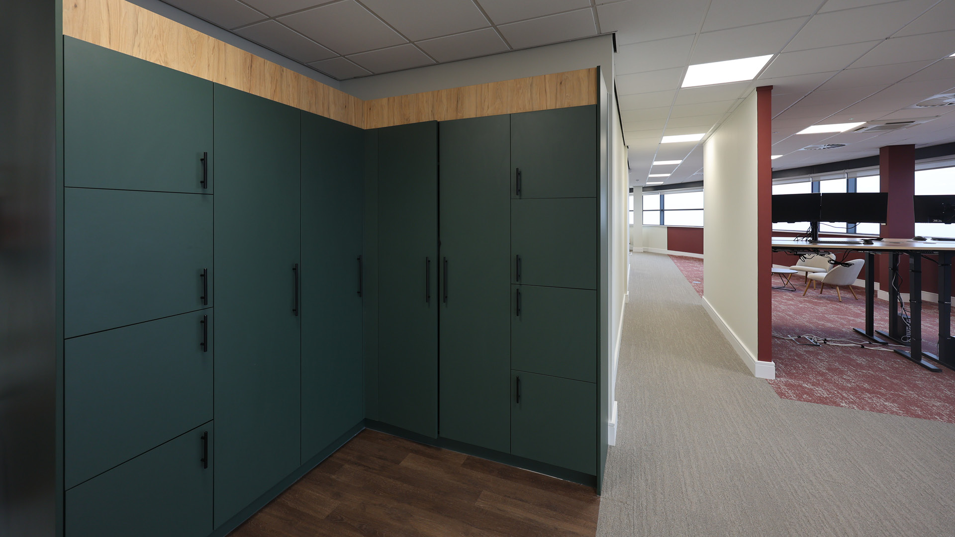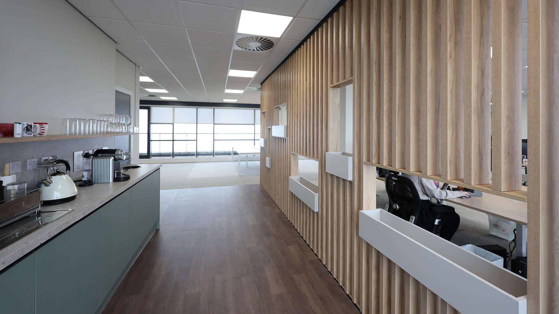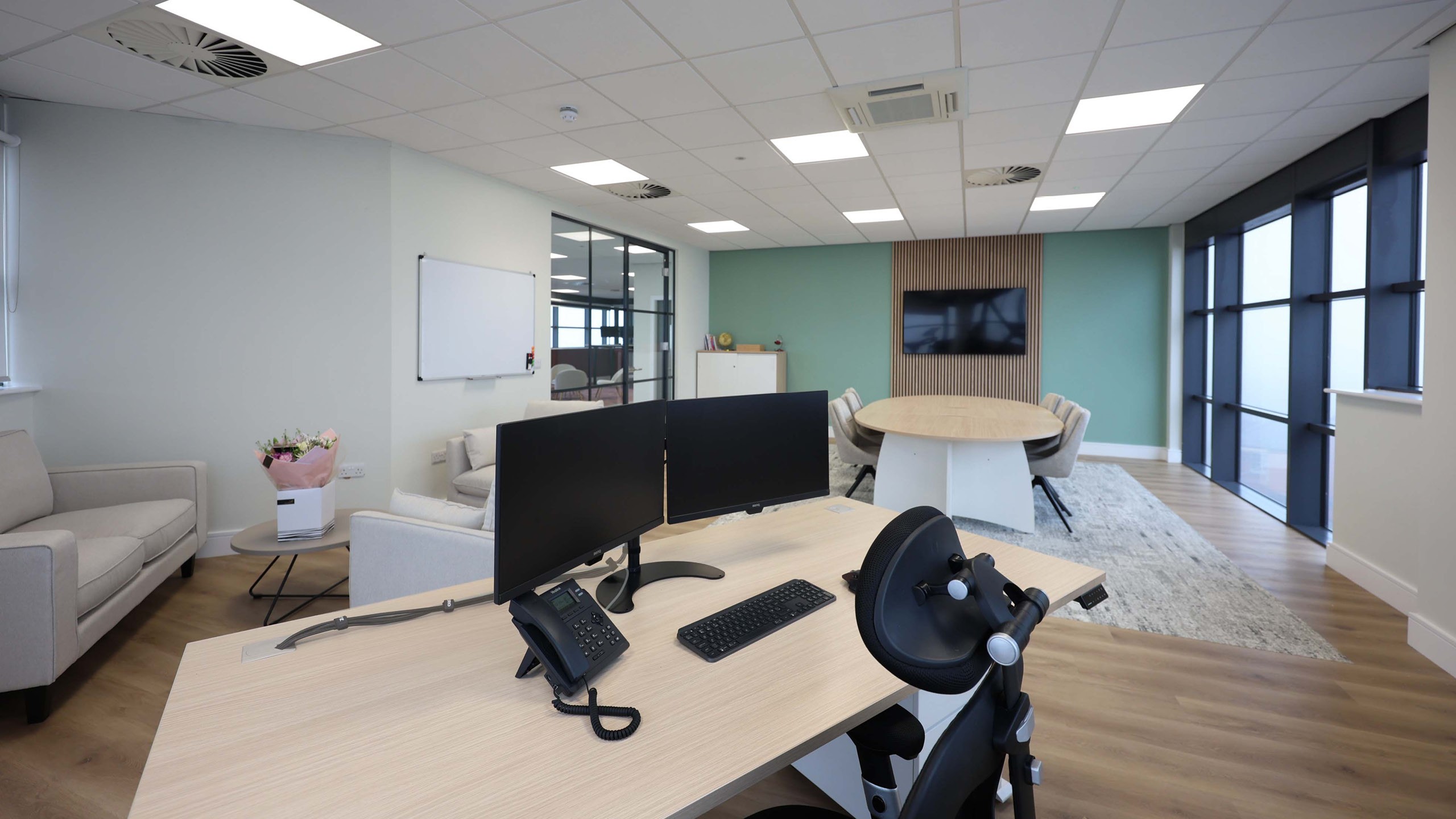Bespoke joinery played a key role in the project, with custom-built storage planter boxes and divider planter partitions helping to define and enhance the space. Additional bespoke elements included a meeting table for the signature snug room, a striking reception desk, a canteen servery and a tea point with a dedicated recycling station—an important feature for the client.